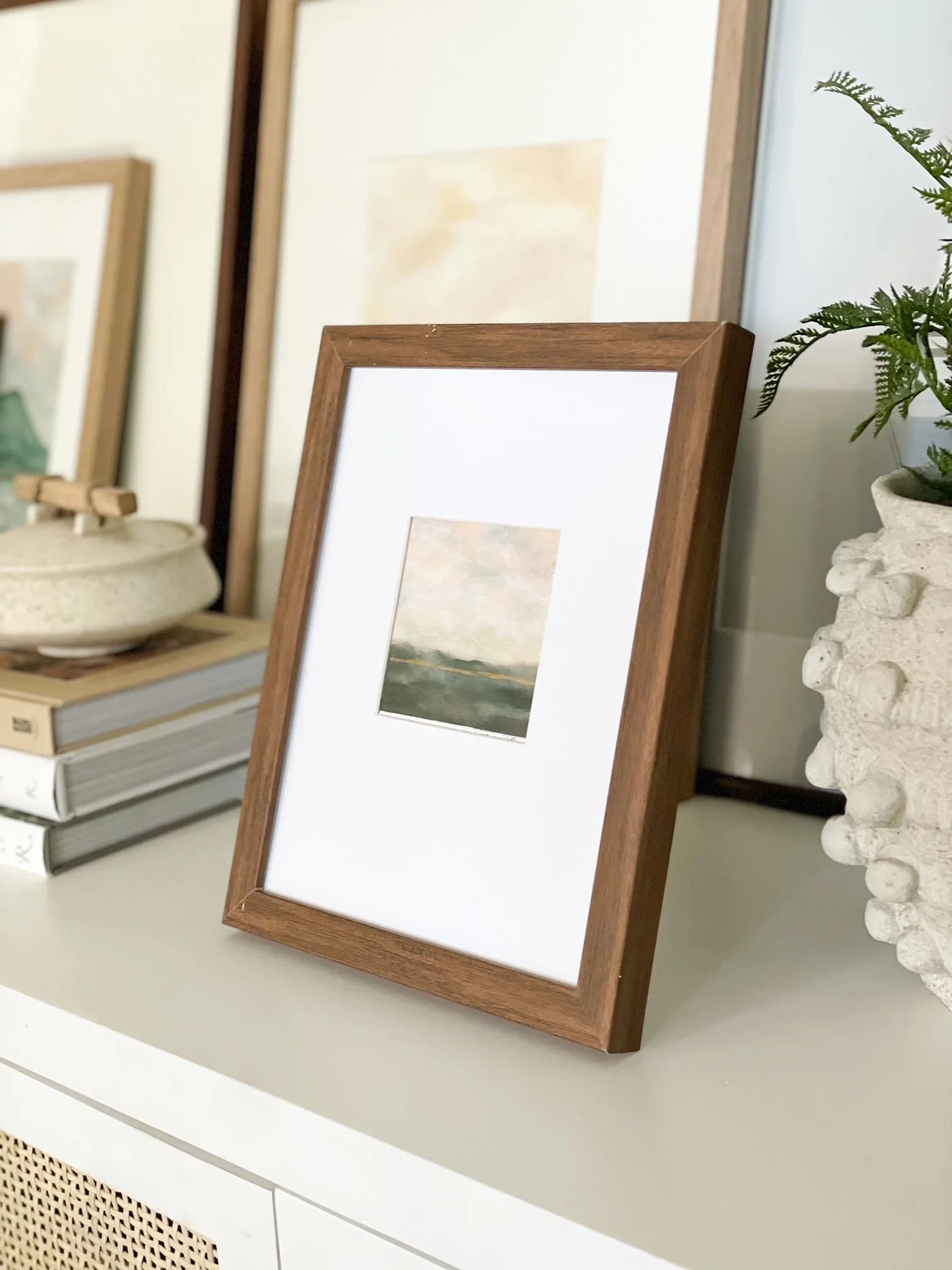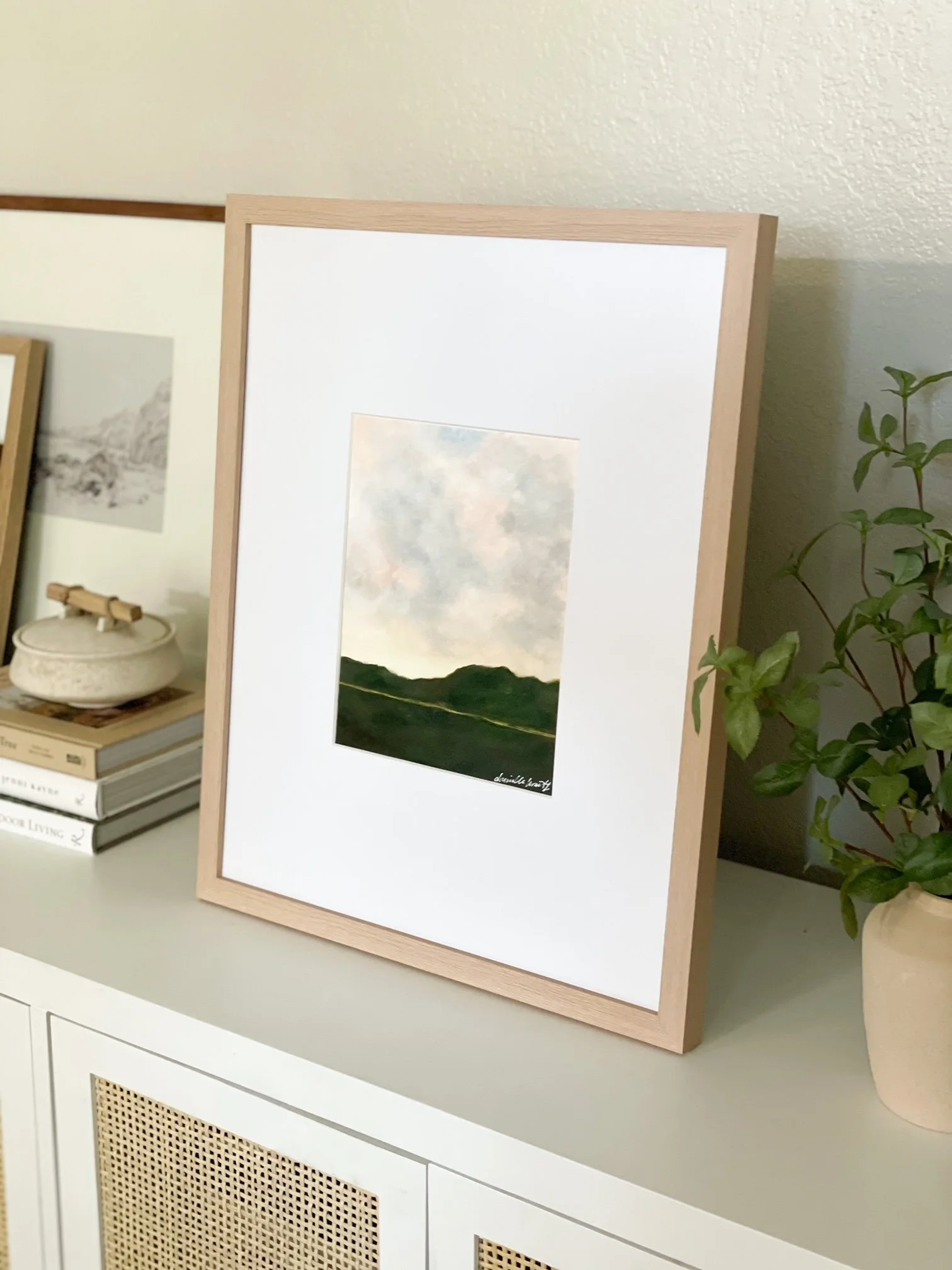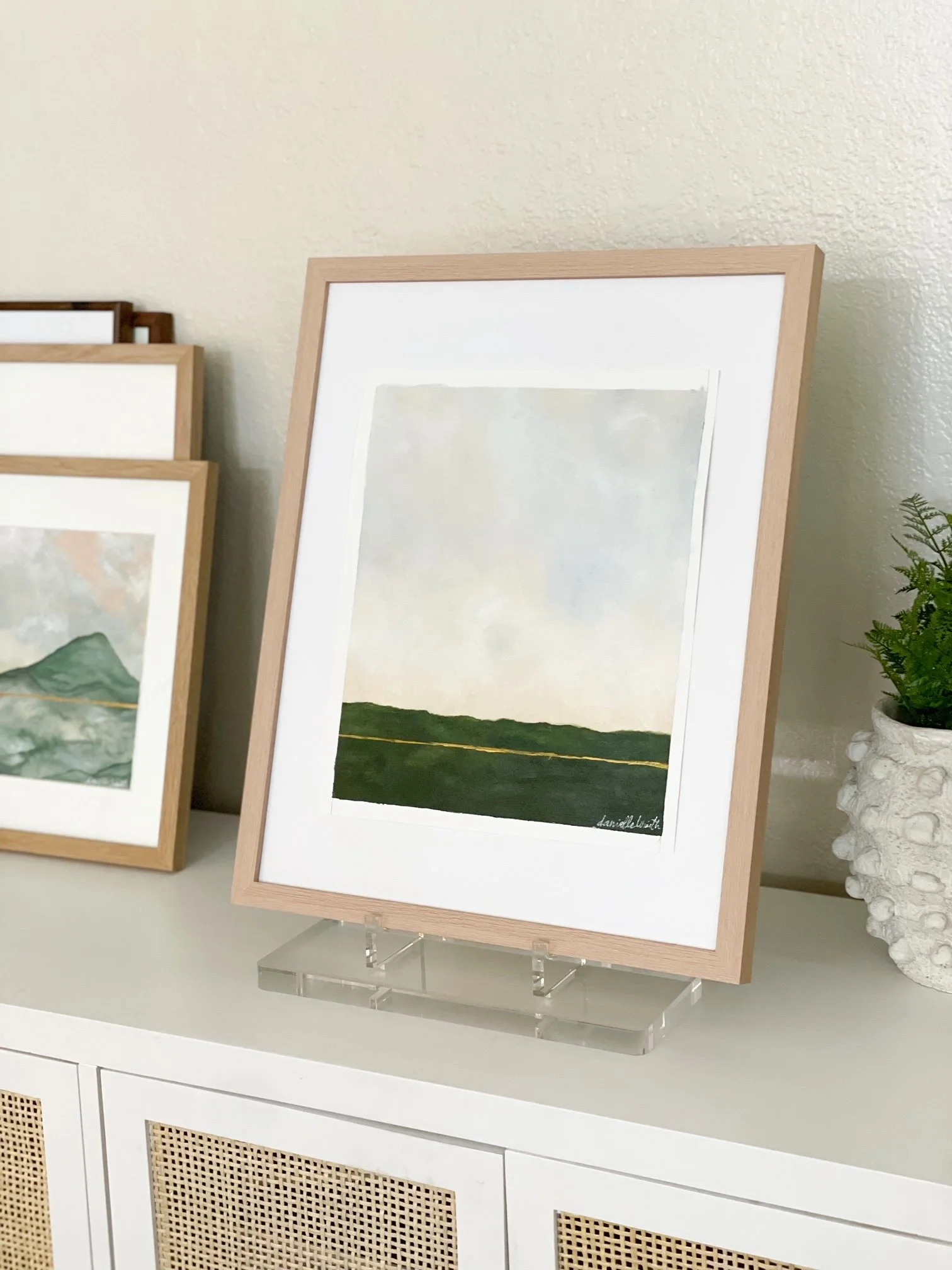I was inspired to create landscapes full of depth and light. The promise of something greater, looming over our broken and complicated lives, gives me great hope and peace. There’s a gold line peeking through each piece that symbolizes the interconnected nature of our lives with our Creator. I love the idea that this delicate, gold line is when we are closest to heaven, but our feet are still on the ground. I’m thankful that this world is only separated from Heaven by a thin veil, just a breath away from where we stand.
